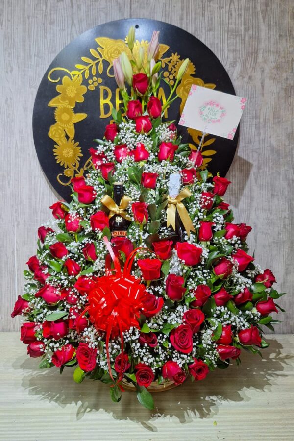 Ramo piramide rosas rojas con botella media de bailleys de 375 ml y vino gato negro.