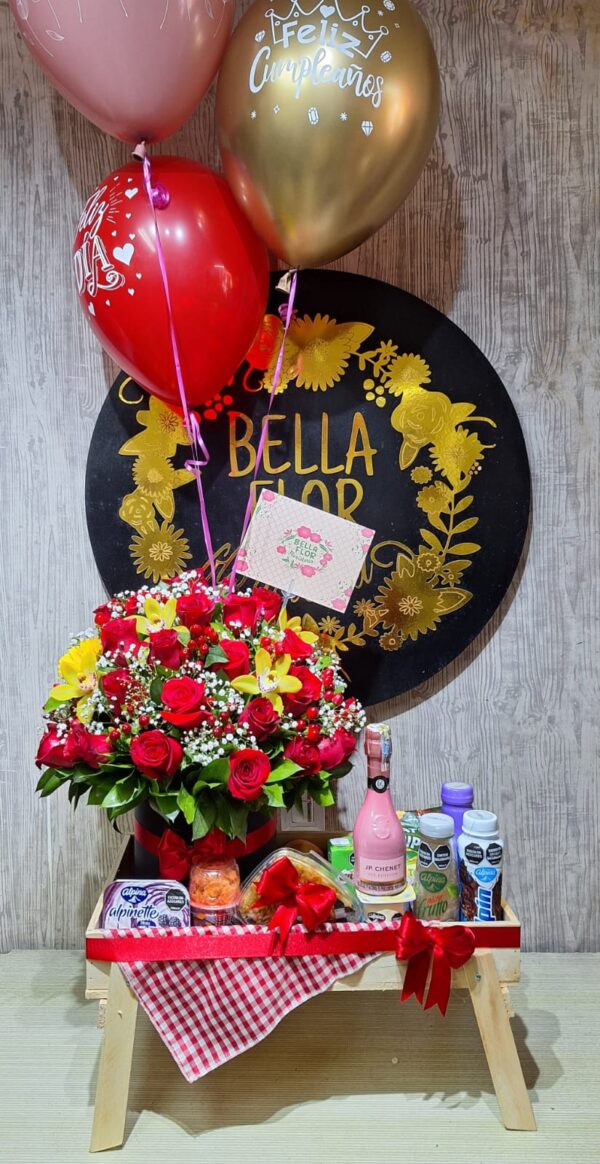 Contiene: Pastel de queso, jugo fruttos, Bonyurth, Alpinette, frutas, 1 Milo caja, 1 M&M, dulces, 1 paquete de platanitos etc, botella pequeña de champaña JP.
