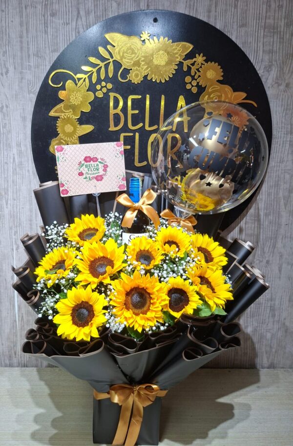 Ramo de Girasoles con botella gato negro.