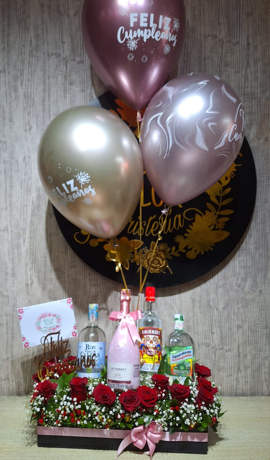 Caja de rosas con botellas de Champaña Jp Chanel, Ron viejo de Caldas, Aguardiente Antioqueño y Smirnoff
