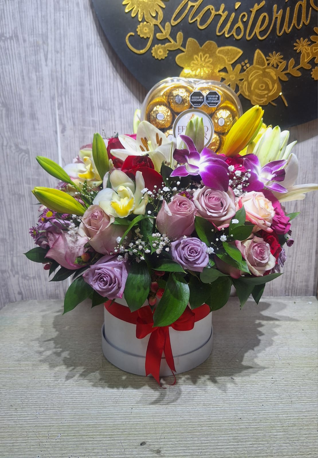 Caja pequeña, con rosas y lirios con chocolates