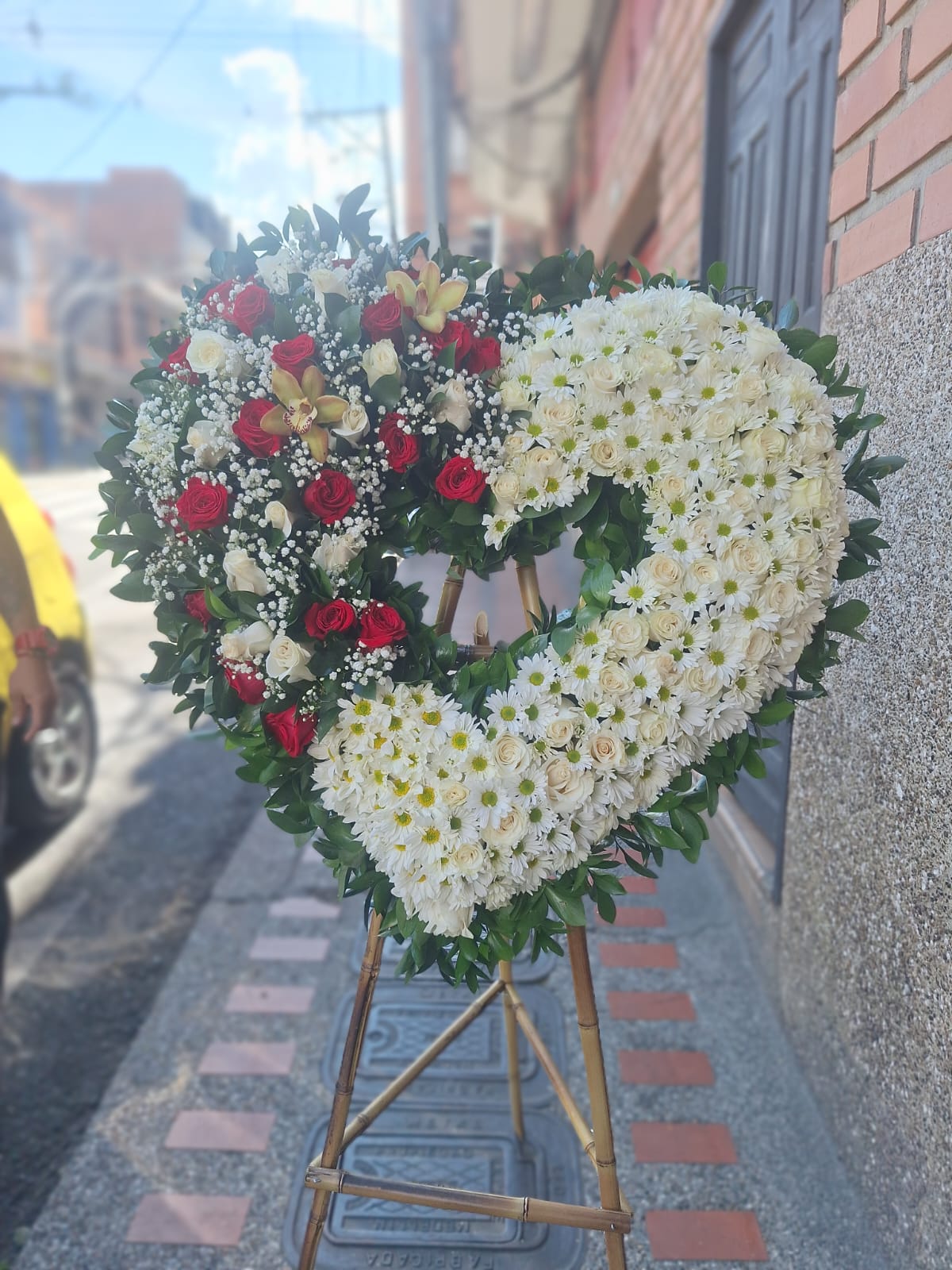 Ramo funebre de corazon con rosas rojas y margaritas!