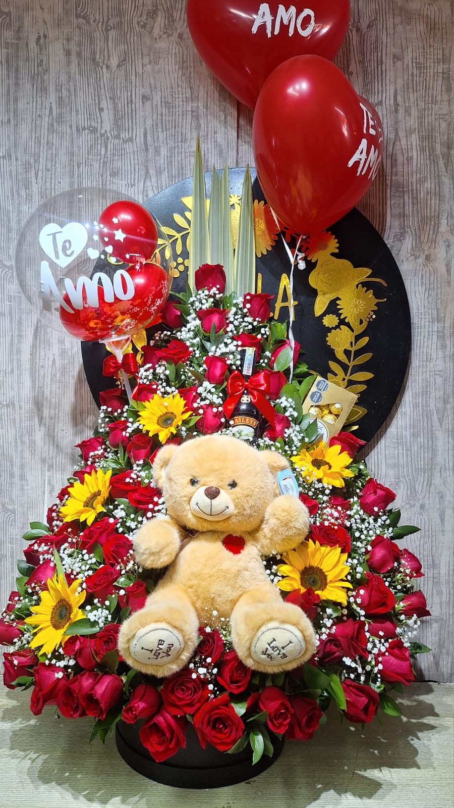 Caja de rosas, con botella bailleys, chocolates, peluche de tu prefrencia y globos !